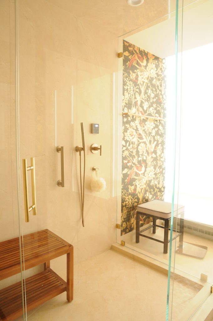 The downtown Chicago condo renovation showcases FORMLINEA’s attention to custom detail throughout the living spaces, featuring bespoke built-in bookcases and custom cabinetry that maximize both storage and style. The spa-like bathroom renovation elevates luxury living with a premium steam shower featuring elegant porcelain slabs for a seamless look. This high-end Chicago condo remodel demonstrates FORMLINEA’s expertise in creating highly personalized living spaces while delivering the refined amenities expected in luxury urban living. Every element of this custom Chicago residence was thoughtfully designed to create a sophisticated, modern home that perfectly balances the owner’s desires with contemporary luxury.